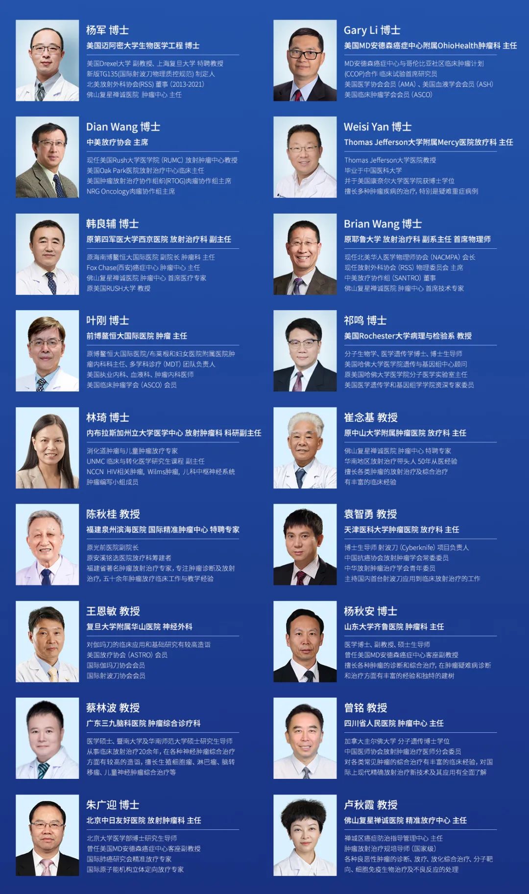 国际多学科MDT会诊团队成员均是国际肿瘤领域的权威专家,有来自世界顶尖肿瘤医疗机构美国MD安德森癌症中心附属 Ohio Health 医院肿瘤内科主任 Dr.Gary Li、中美放疗协会主席、美国 RUSH 大学医学中心(RUMC) 放射肿瘤科教授Dr.Dian Wang、Baptist Health System 放疗科主任 Dr.Weisi Yan、原中山大学附属肿瘤医院放疗科主任、中国华南地区放射治疗带头人 崔念基教授等,毫不夸张地说,一次MDT会诊,看遍全球TOP肿瘤专家。