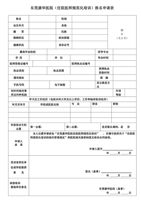 东莞康华医院(住院医师规范化培训)报名申请表  点击下载